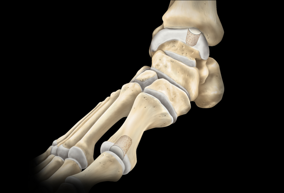 For smaller defects (<1.5 cm², often cystic), OATS harvests 6-10 mm cylindrical plugs from low-load autologous sites (e.g., knee trochlea or ipsilateral talar non-articular area) using coring tools. The recipient site is reamed to depth, and plugs are press-fit in mosaic fashion for immediate hyaline coverage and bony integration. Orthobiologics (PRP/BMAC) are applied at interfaces to reduce donor morbidity and promote osseous healing, minimizing graft subsidence.